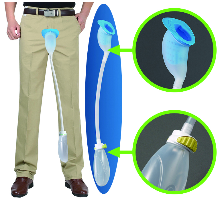 外出時のトイレの不安を無くす装着型の男性用集尿器。