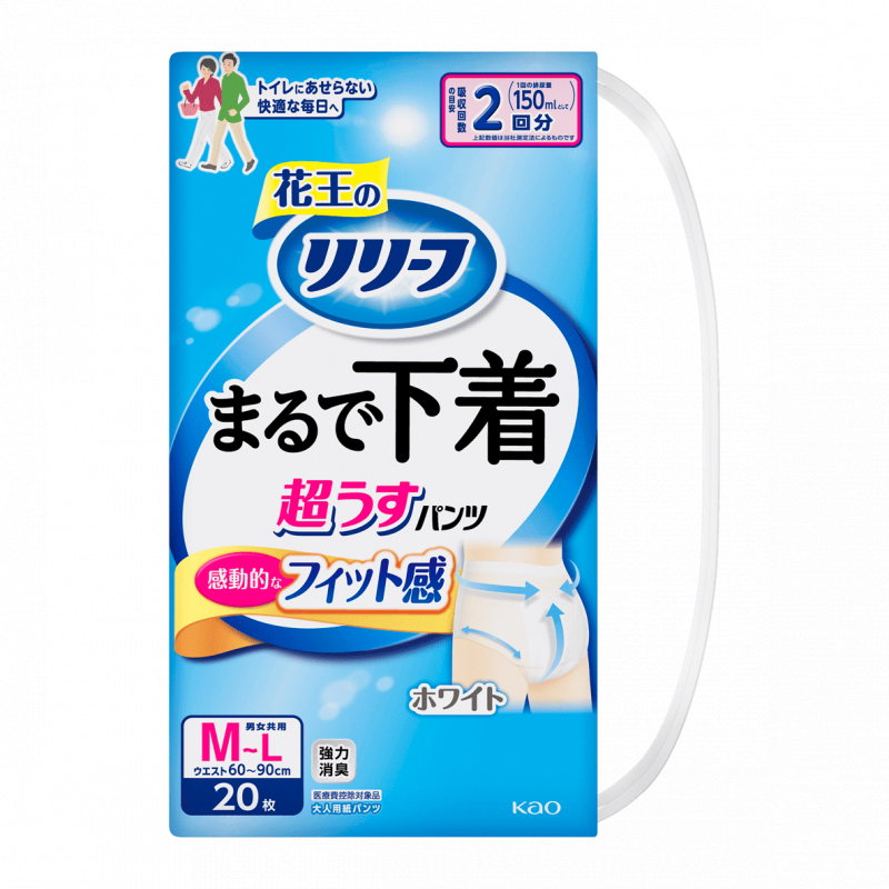 急な尿意やふとした瞬間のモレで困った経験はありませんか?「リリーフ まるで下着」があれば、すぐにトイレに行けない外出時でも安心して過ごせます。薄くてよく伸び、フィットする花王独自の伸縮素材(特許技術)を採用。紙パンツをはいているのを忘れてしまう、綿下着のようなはき心地です。ムレにくい「全面通気性」で、湿気をためこみません。さらに、アンモニア臭を強力消臭。人との距離も気になりません。2回分の尿をすばやく吸収!長時間のお出かけ時も安心して過ごせます。
