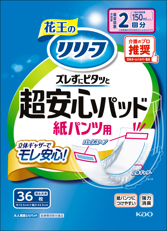 使いやすいパッドで、とりかえの手間や経済的負担を減らします。横モレ防止立体ギャザーがイヤな横モレをブロック!さらに幅広テープが紙パンツにピタッとつくから、着用中のズレもしっかり防ぎます。全面通気シートを採用!外側に湿気を追い出すから、ムレにくく快適なつけ心地を実現しました。さらに消臭成分をシートに配合。アンモニア臭の発生を強力に抑えます。リリーフは、パッドも紙パンツも青色の目印線が入っているから、迷わずまっすぐつけられます。