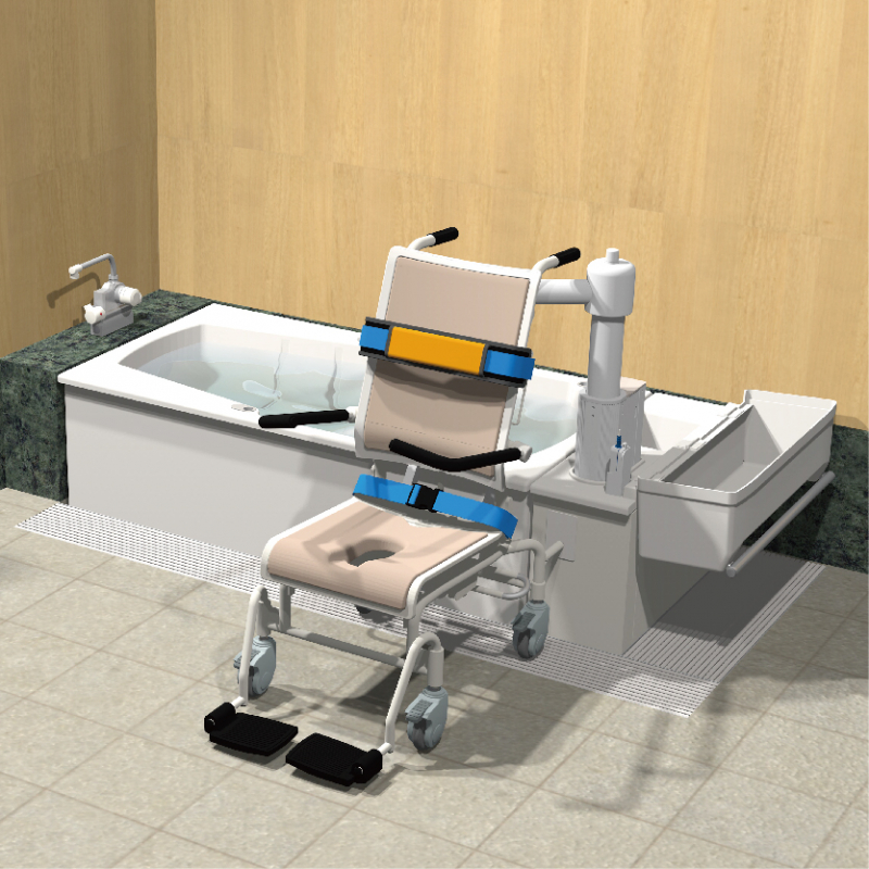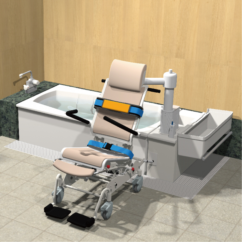 昇降機を備えた浴槽と電動昇降ストレッチャーを組み合わせたオールインワン介護浴槽です。より多くのサポートを必要とする方に、少ない介助負担で快適なお風呂を提供します。
