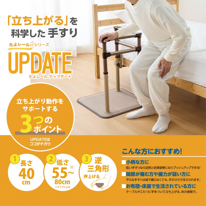 立ち上がり動作を支援する据置式手すり。手の平で支えやすい逆三角形の断面形状や、暗所でも握りやすい蓄光ラインが特長。豊富なサイズ展開とオプションで、生活環境に合わせた設置が可能です。