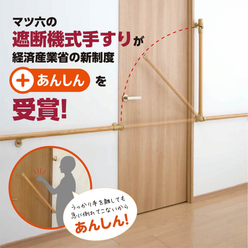 経済産業省の新制度「+(プラス)あんしん」を受賞!ドアの前等で手すりが途切れる箇所を繋ぎ、自立した生活を支えます。基本機能に加え、日常の「うっかり」にも配慮した高い安全性が認められました。