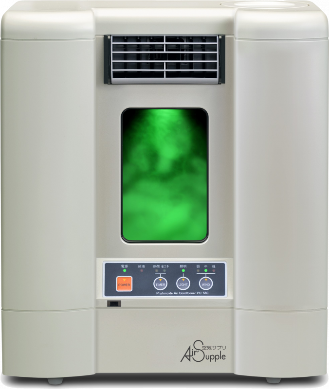 天然植物由来のフィトンチッド溶液PT150®︎を、自然界類似拡散方式(特許取得)により1ミクロン以下の極超微粒子で室内に噴霧し、安全に広域空間での空気浄化を実現する次世代空気清浄機です。