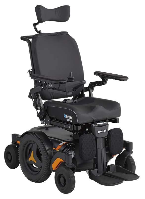 走行性、小回り性に優れた6輪タイプの電動車いす。ご自身で姿勢の安定と安楽性を調整できる電動ティルト機能付き。
