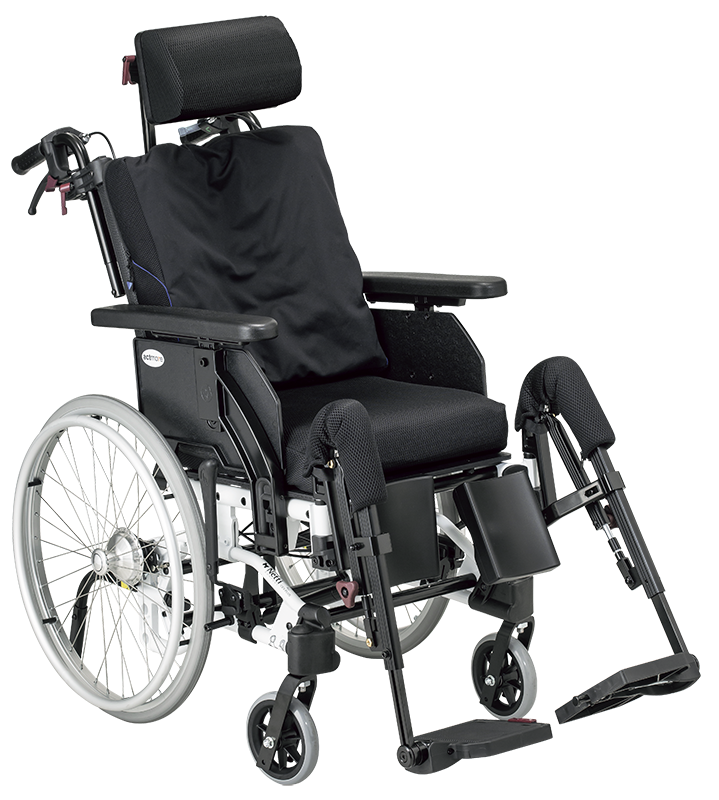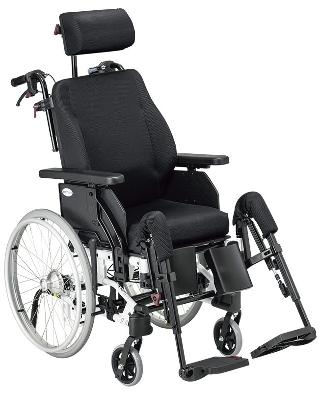 立体背シートで背筋をサポートし、作業姿勢がとりやすい適合調整機能が豊富なティルト&リクライニング車いすです。